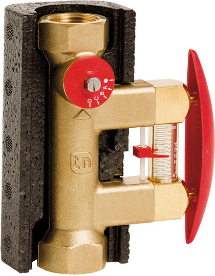 Strangregulier- und Absperrventil mit direkter Anzeige der eingestellten Durchflussmenge in l/min. Parallel zum Hauptvolumenstrom geführter, automatisch absperrender Bypass mit Mess- und Anzeigeteil. Messteil mit Schwebekörper und Gegenfeder. Messwerte am Schauglas ohne Hilfe von Tabellen, Diagrammen und Messgeräten direkt ablesbar. Geringer Druckverlust. Wärmedämmung aus EPP, gemäß EnEV-Richtlinie.