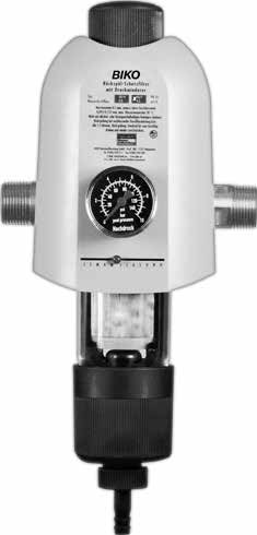 Rückspül-Schutzfilter mit Druckminderer für den Einsatz in kaltem Trinkwasser von maximal 30 °C. Anschluss an Rohrleitungsnetz mit Einbau-Drehflansch (Quickset-E) mit Bajonettverschluss. Mit Manometer 0 – 10 bar für Nachdruckanzeige