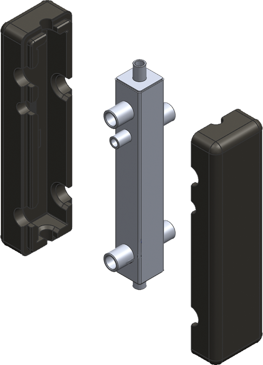 Anschluss-Stutzen R 2 AG, Rp 1/2 Muffen für Entlüftung, Entleerung und Tauchhülse für Temperatursensor. Mit Entlüfter, Tauchhülse und EPP-Dämmung nach EnEV.