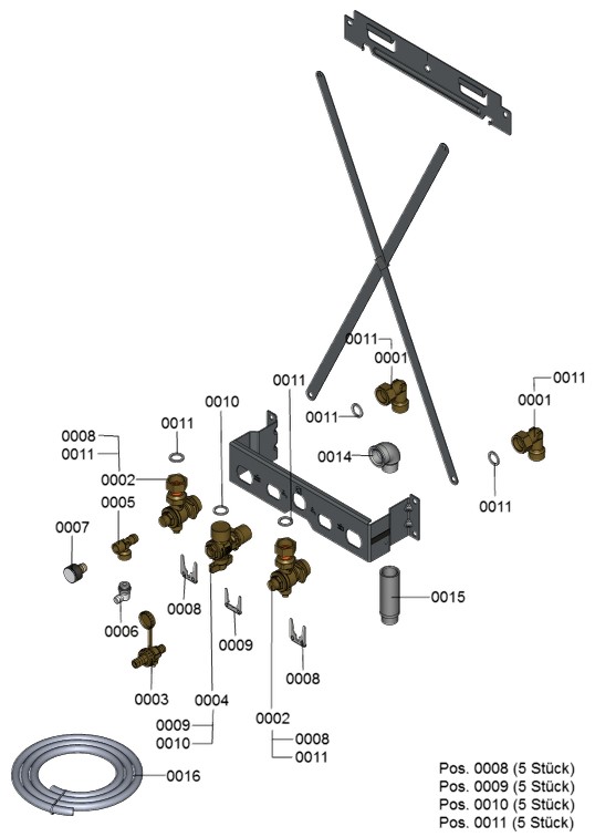 Montagehilfe für Aufputz-Montage mit Befestigungselementen, Armaturen und Gasabsperrhahn.