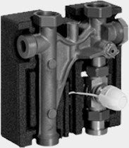Anschlussgruppe zur einfachen Montage. Nennweite R 1, einsetzbar bis 2,5 m³/h Nenn-Volumenstrom.