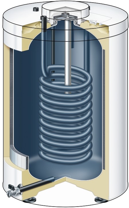 Untergestellter Speicher mit innenliegender Heizwendel für die Trinkwassererwärmung mit Wandgeräten.