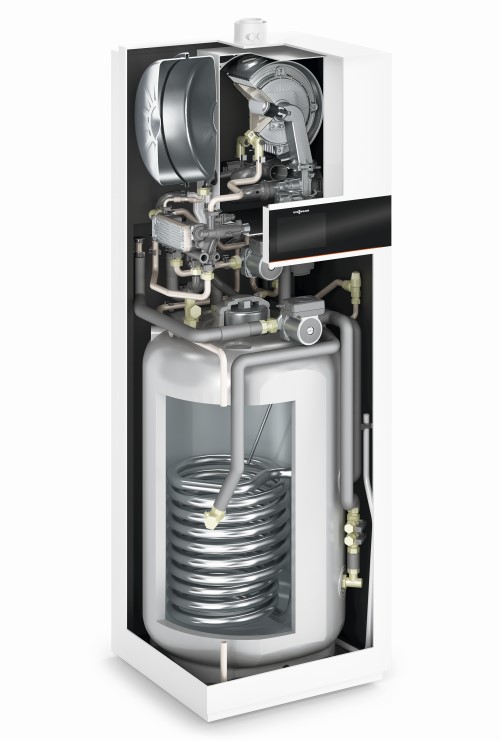 Gas-Brennwertkompaktgerät für Erd- und Flüssiggas mit integriertem bivalenten Solarspeicher für solare Trinkwassererwärmung.