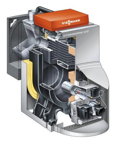 Öl-Brennwertkessel als Guss-Heizkessel mit nachgeschaltetem Öl-Brennwert-Wärmetauscher. Typ BR2A - Abgas/Zuluft ist raumluftunabhängig. Gussgliederkessel nach EN 303 (DIN 304).