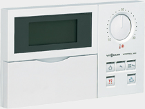 Fernbedienung für einen Heizkreis zum Anschluß an die Vitotronic 200, 300, 333-K und 200-H (Typ HK1W/HK1S und HK3W/HK3S). Die Vitotrol 300 hat eine großzügige, beleuchtete Displaydarstellung mit Klartextunterstützung, Einstellmöglichkeiten für Tages- und Nachttemperatur sowie Trinkwassertemperatur. Beleuchtete Betriebarten-Wahltaster, Party- und Spartaste. Einstellung für Ferienprogramm und Schaltzeiten für den Heizkreis, Speicher-Wassererwärmer und Zirkulationspumpe. Abfrage der Betriebszustände und Anzeige von Störungen. Mit Raumtemperatursensor zur Raumtemperaturaufschaltung für den Heizkreis mit Mischer.